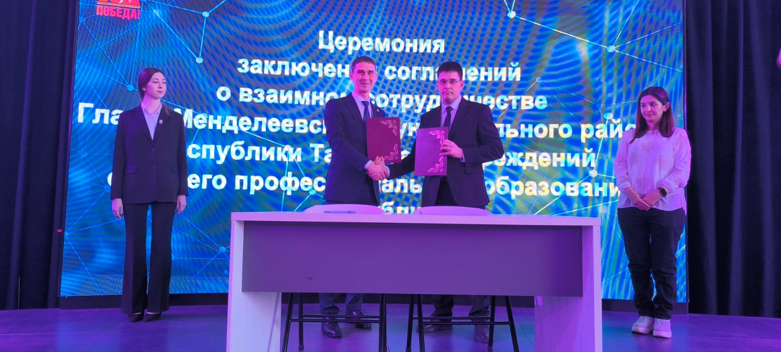 В рамках профориентационного мероприятия Глава Менделеевского района Роберт Искандаров и директор Набережночелнинского политехнического колледжа ПК Ильдар Ганиев подписали соглашение о сотрудничестве между Администрацией Менделеевского района и колледжем. Такие же соглашения были подписаны с другими средне-специальными учебными заведениями Закамского региона.