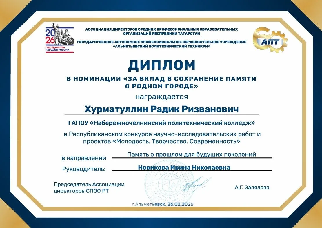 Хурматуллин Радик (гр. ТМ-9) представлял свою исследовательскую работу по направлению "Память о прошлом для будущих поколений" и был удостоен Диплома в номинации "За вклад в сохранение памяти о родном городе" (научный руководитель – Новикова Ирина Николаевна).