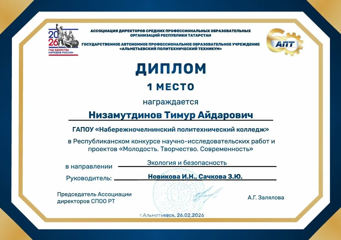 Низамутдинов Тимур (гр. ТЭ-28) выступил по направлению «Экология и безопасность» и стал победителем – Диплом 1 степени (научные руководители – Новикова Ирина Николаевна и Сачкова Злата Юрьевна).