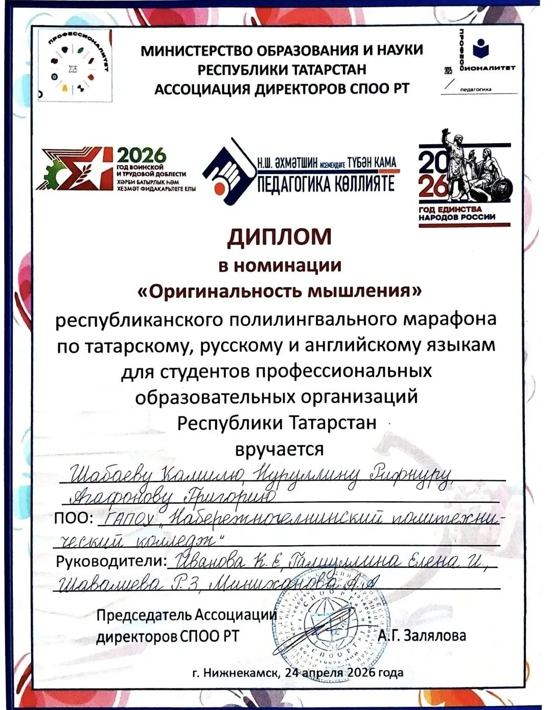 24 апреля 2026 года на базе ГАПОУ "Нижнекамский педагогический колледж" царила особенная атмосфера. Здесь собрались самые мотивированные и творческие студенты системы среднего профессионального образования, чтобы принять участие в Республиканском полилингвальном марафоне, посвящённом владению татарским, русским и английским языками.