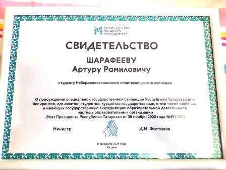 8 февраля на базе Арт-резиденци "Созвездие-Йолдызлык" города Казани состоялось чествование представителей учреждений СПО и ВПО, удостоенных специальной государственной стипендии Республики Татарстан для аспирантов, адъютантов, студентов, курсантов государственных образовательных учреждений в соответствии с Указом Президента Республики Татарстан от 30 ноября 2020 года Р.Н. Минниханова.