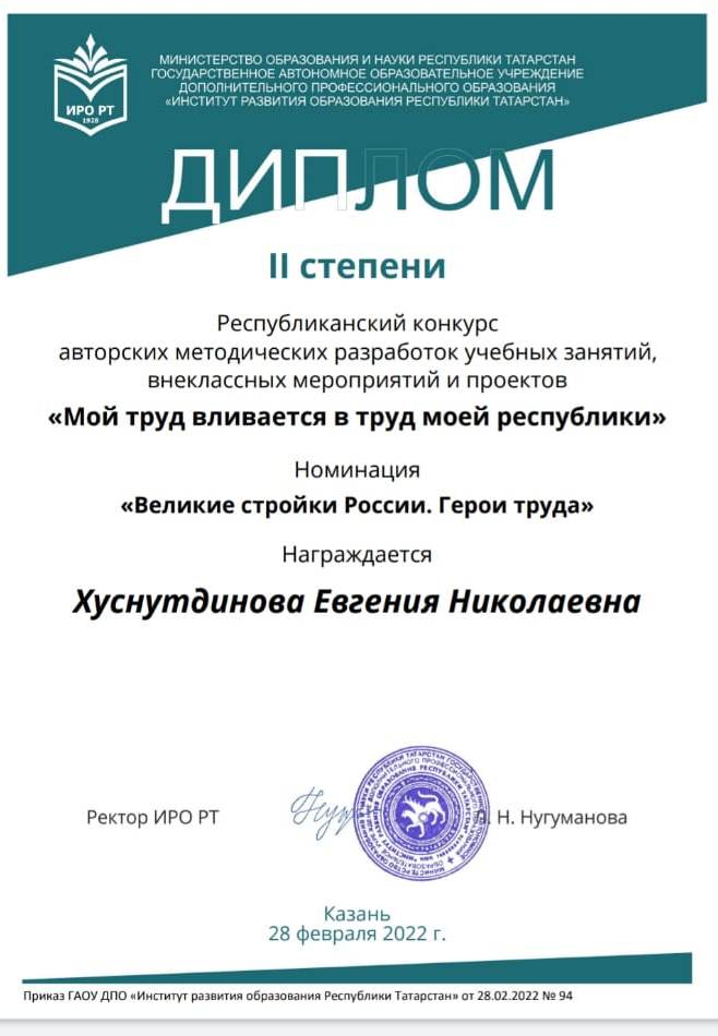 Поздравляем преподавателя истории Хуснутдинову Евгению Николаевну со 2 местом в номинации "Великие стойки России. Герои труда" Республиканского конкурса авторских методических разработок учебных занятий, внеклассных мероприятий. Статус участников конкурса был весьма обширным: детские сады, школы, центры творчества, колледжи. Евгения Николаевна подготовила конкурсную работу на тему "История великой стройки: Герои Социалистического труда в летописи г. Набережные Челны".