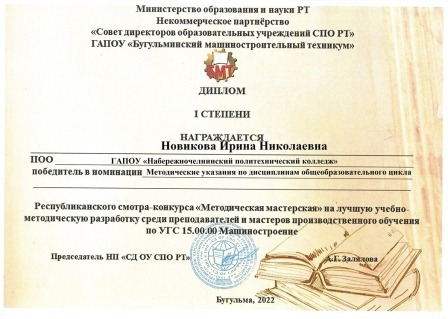 - в номинации "Методические указания по дисциплинам общеобразовательного цикла" Новикова Ирина Николаевна – 1 место.