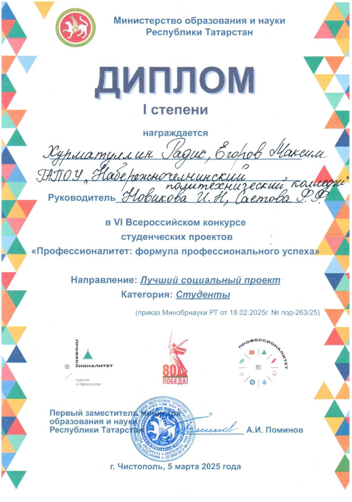 Наш колледж представляли студенты 1-го курса Хурматуллин Радик и Егоров Максим, обучающиеся по специальности "Технология машиностроения". Они демонстрировали исследовательскую работу в номинации «Социальный проект», их работа была удостоена Диплома 1 степени!