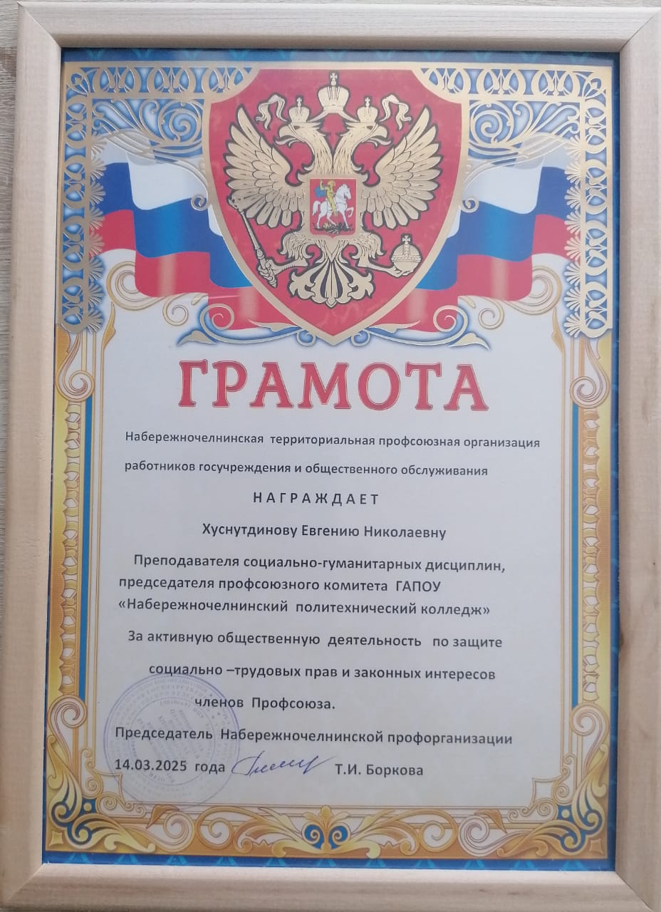 Завершилась конференция награждениями профсоюзного актива за активную общественную деятельность в Профсоюзе, среди которых и председатель профсоюзного комитета Набережночелнинского политехнического колледжа Евгения Николаевна Хуснутдинова.