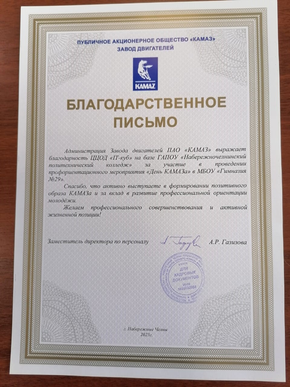 ЦЦОД "IT-куб Набережные Челны" еще раз подчеркнул важность знаний из IT-сферы для школьников. В завершение мероприятия организаторы от завода двигателей вручили благодарственное письмо за активное участие и вклад в развитие интереса к технологиям среди детей.