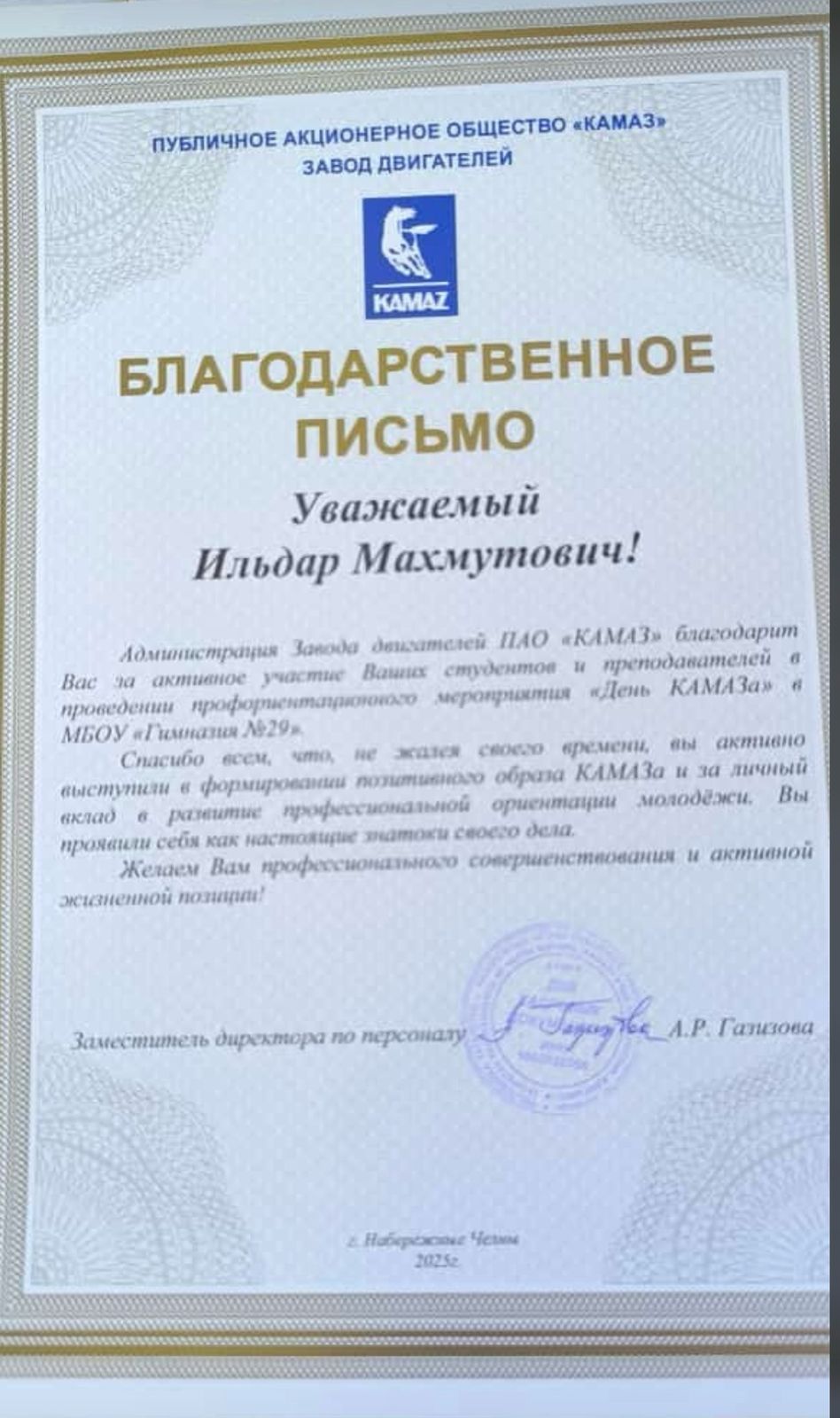 Организаторы мероприятия – завод двигателей ПАО "КАМАЗ" – поблагодарили педагогический коллектив, студентов и лично директора НПК Ильдара Махмутовича Ганиева за активное участие в профориентационной деятельности среди школьников.