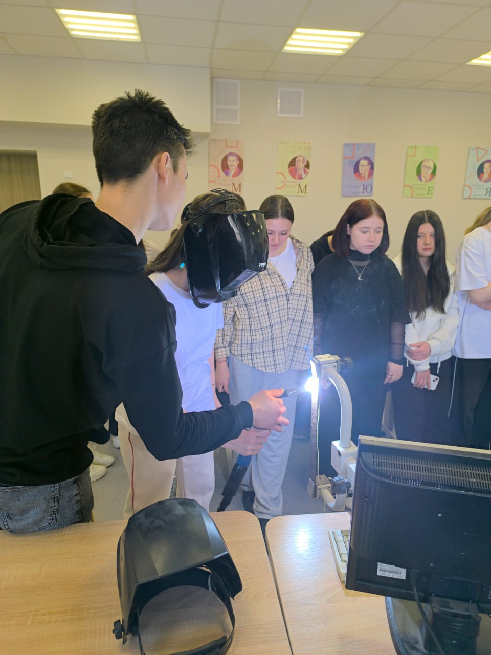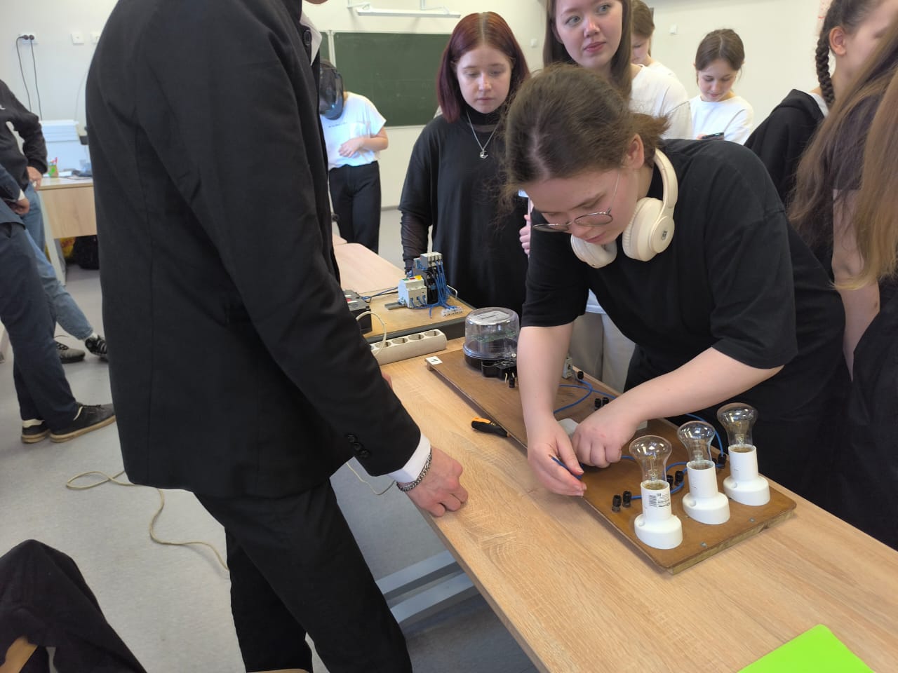 После теории началась самая интересная часть — практика! Ребята попробовали себя в роли электриков, сварщиков и наладчиков станков с ЧПУ: зачищали и армировали провода, собирали электрические схемы, запускали асинхронный двигатель, измеряли детали штангенциркулем и даже варили швы на сварочном имитаторе.