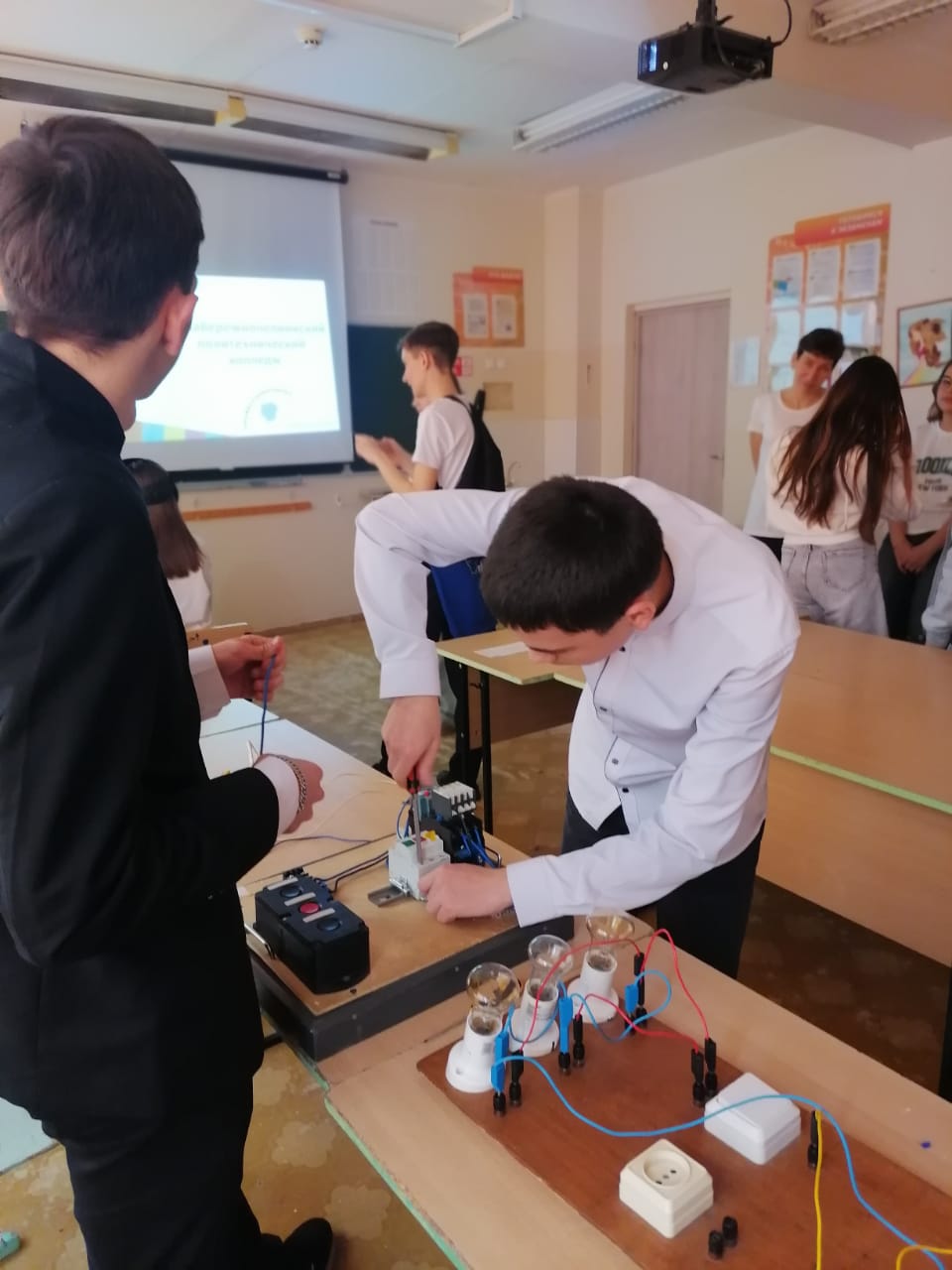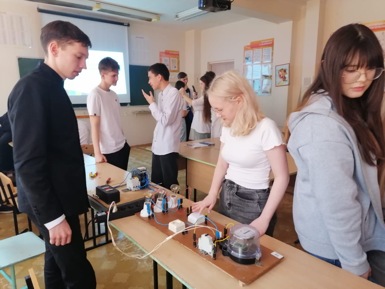 Школьники разбирались в устройстве домашней электросети — от щитка до лампочки. Они собирали схему на учебном стенде, учились зачищать провода и даже запускали асинхронный двигатель!