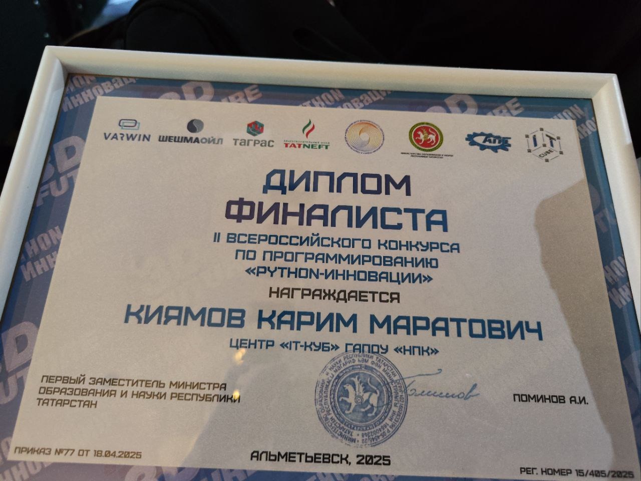 Пройдя заочный этап II Всероссийского конкурса по программированию "Python-инновации" в номинации "Командная строка», Карим был приглашен на второй, очный этап. Пройдя жеребьевку, конкурсантам предстояло разработать индивидуальный проект по техническому заданию от партнеров Конкурса, подготовить его презентацию и защитить.