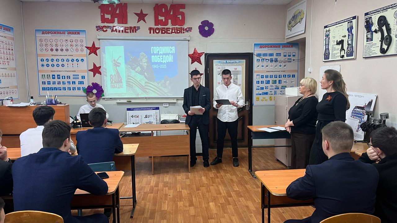 В учебном кабинете собрались около 60 студентов, чтобы вместе перелистать героические страницы военной летописи. Участники услышали пронзительные рассказы о тяжёлых испытаниях, выпавших на долю советского народа, о мужестве на фронте и стойкости в тылу. Все это сопровождалось мультимедийной презентацией, подготовленной студентами.