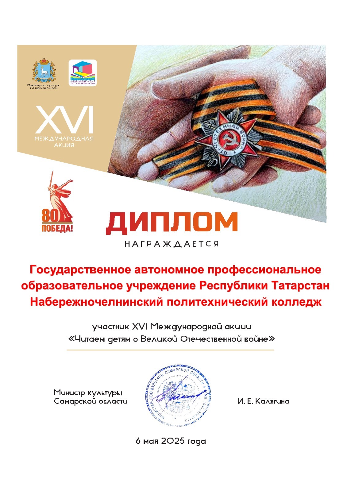 16-я Международная акция "Читаем детям о Великой Отечественной войне" объединила участников из 87 регионов России и 8 зарубежных стран. В их числе – Набережночелнинский политехнический колледж.
