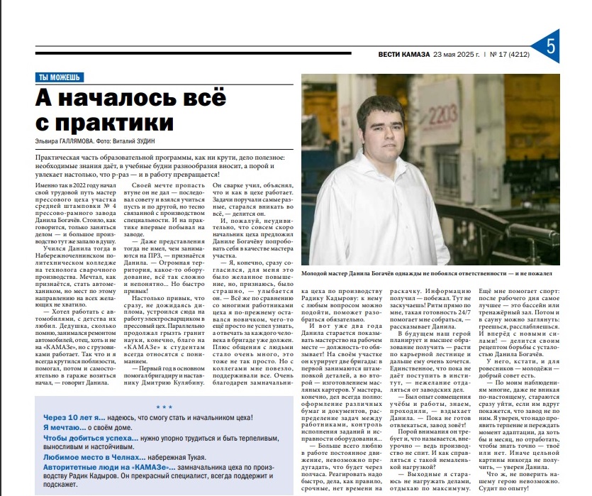 Его история – отличный пример того, как качественное образование и целеустремлённость помогают достичь высот в профессии. Недавно интервью с Данилой было опубликовано в корпоративной газете «Вести КАМАЗа» – это признание его успехов и вклада в развитие компании.