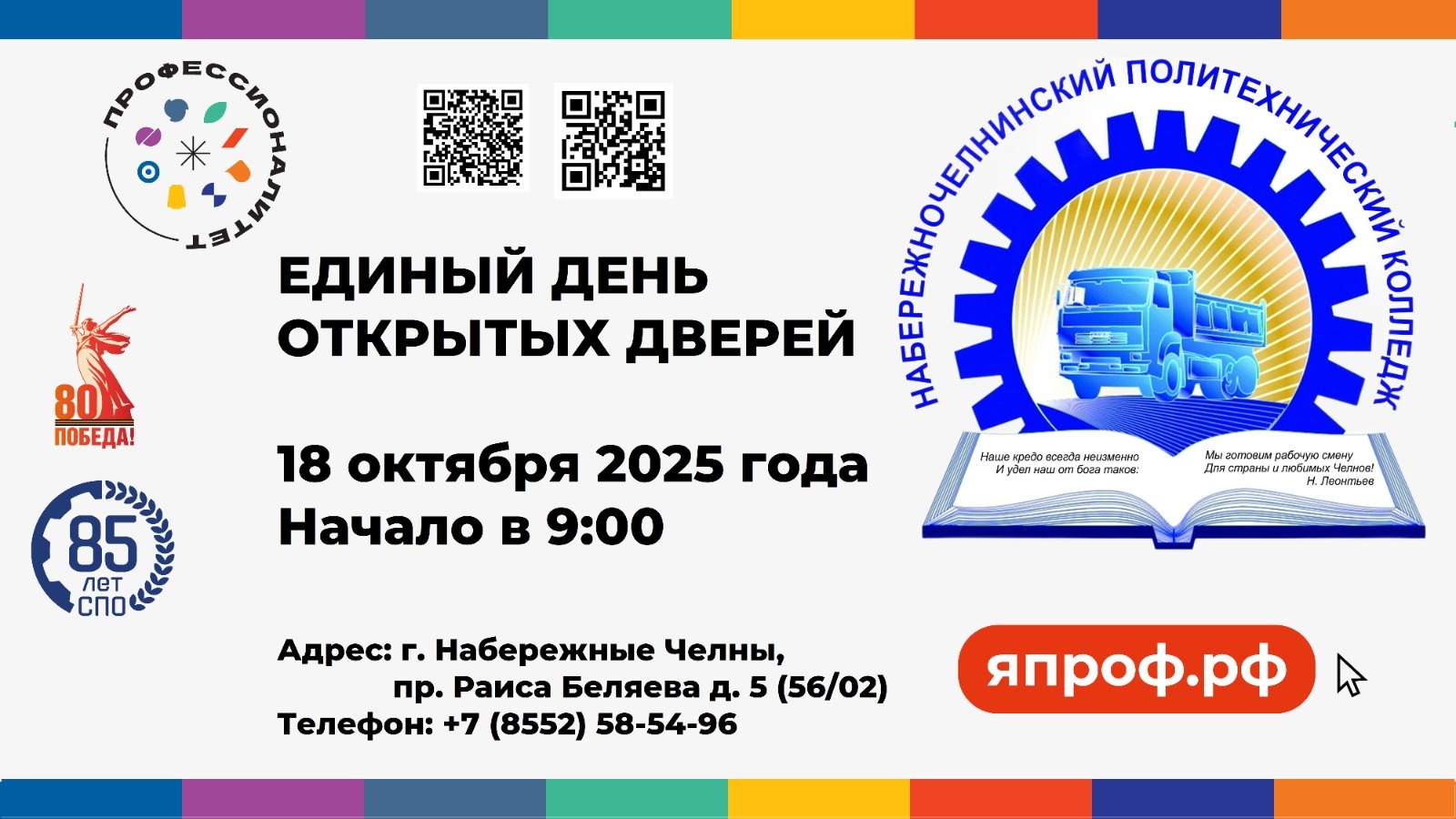 Приглашаем вас на Единый день открытых дверей (ЕДОД) в кластер федерального проекта "Профессионалитет" - Набережночелнинский политехнический колледж, который состоится 18 октября 2025 года, начало в 9:00.