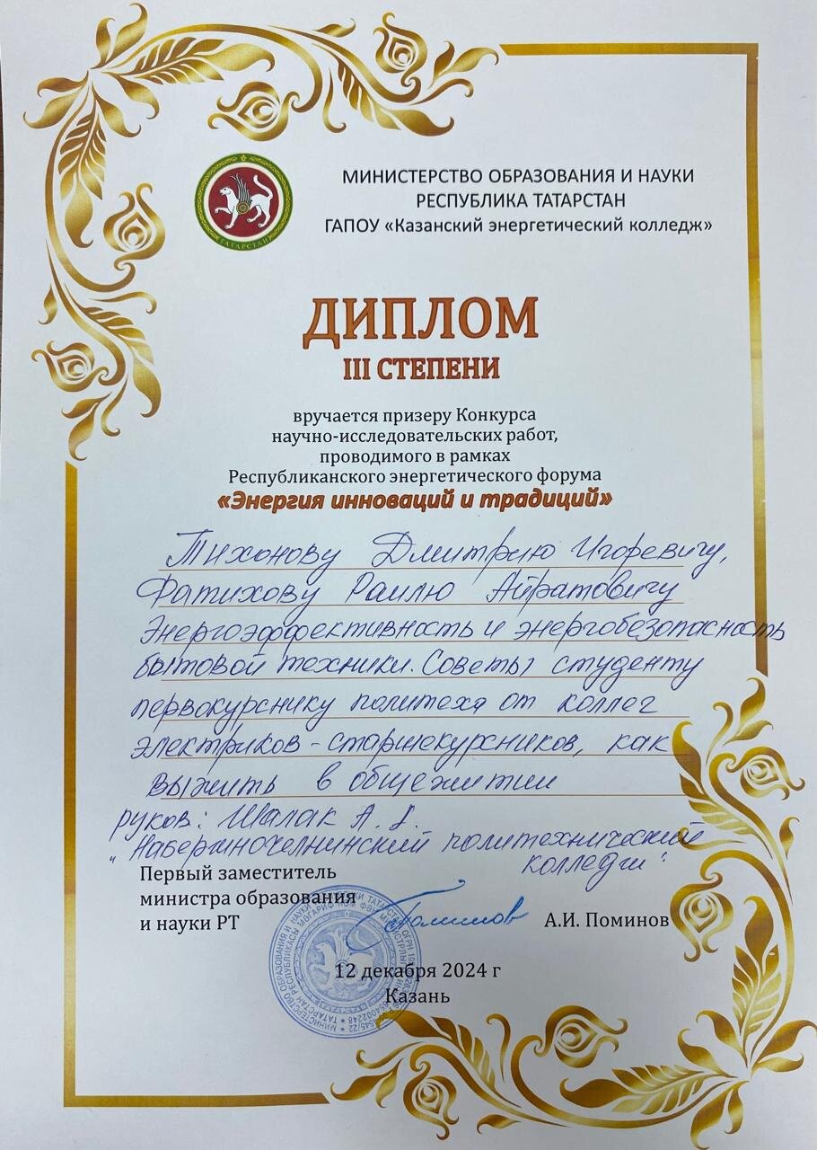 Студенты группы ТЭ-20 Набережночелнинского политехнического колледжа Тихонов Дмитрий и Фатихов Раиль представили на конференции работу по теме "Энергоэффективность и энергобезопасность бытовой техники. Советы студенту-первокурснику политеха от коллег электриков-старшекурсников, как выжить в общежитии". Ребята отлично выступили по заявленной теме, продемонстрировали умение формулировать цели и задачи исследования, глубину исследования и блестящее владение материалом. По итогам работы жюри нашей работе присвоено 3 место Республиканской научно-практической конференции по специальности. Поздравляем наставника Шалак А.А. и ребят с достойным результатом.